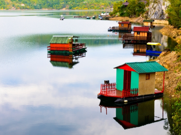 Lake Perućac, on the other hand, has a lively and social atmosphere. It stretches for 54 kilometres and was formed by damming the Drina River. This lake is popular for floating houses, many of which can be rented overnight. Many floating houses also have small boats, BBQ equipment, and fishing gear.
